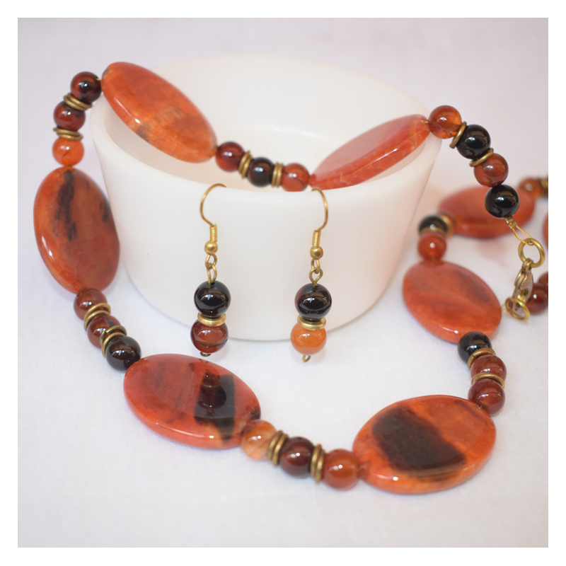 Turn heads with this bold fire agate necklace and matching earrings set. Featuring rich, warm tones with natural depth, this statement piece adds character and confidence to any outfit.